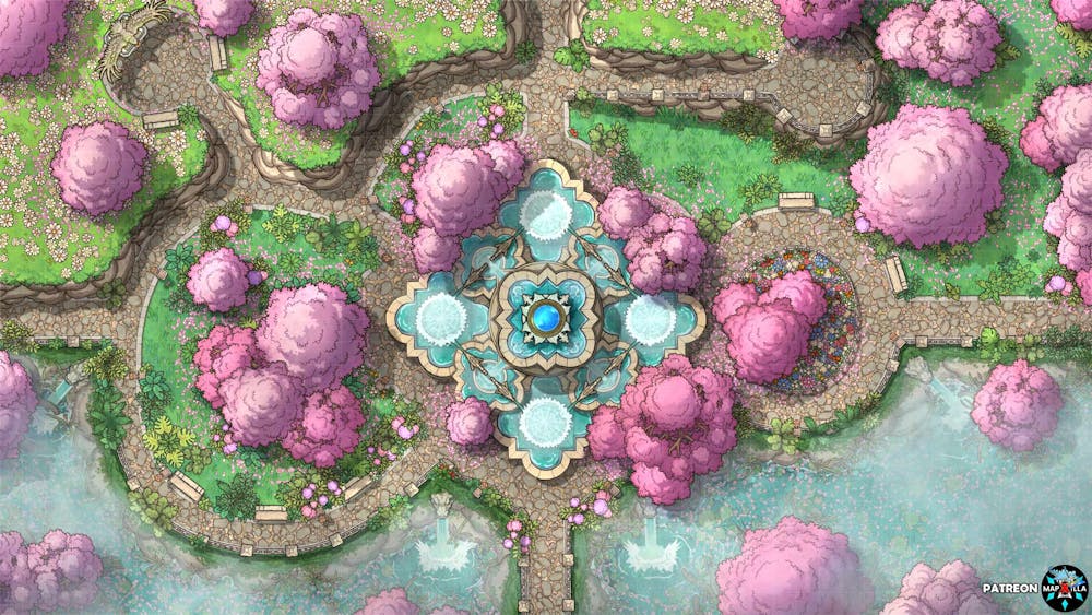 The sound of flowing water can be heard before the fountain can even be seen. Surrounded by a lush garden and healthy, blossoming cherry trees, this imposing fountain endlessly pours out fresh, drinkable water. This is thanks to a large magic gem that rests atop the whole structure. Should that gem ever be removed, the entire garden would dry up quickly as all the plants begins to wilt and die.