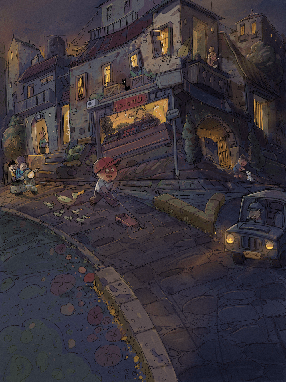 A small fruit stand—“la belli”—buzzes with soft conversation, as the grocer, framed in yellow light, serves the last of the day's customers. A child, full of mischief, chases his runaway skateboard into a group of waddling ducks, scattering them with a triumphant grin. On the lower steps, a little one giggles at a puppy tugging a leaf, while across the road, an elderly woman waves from her balcony, savoring the slow magic of dusk.