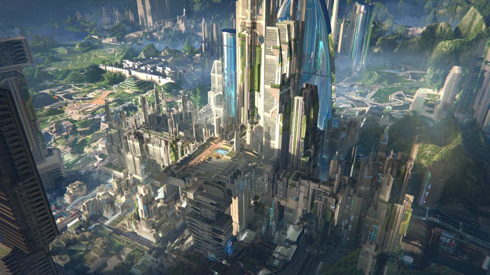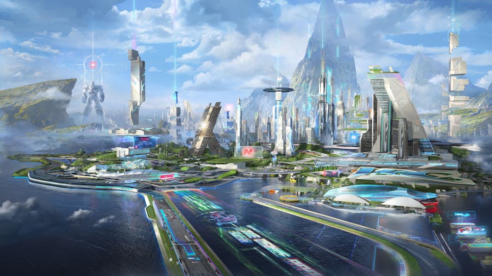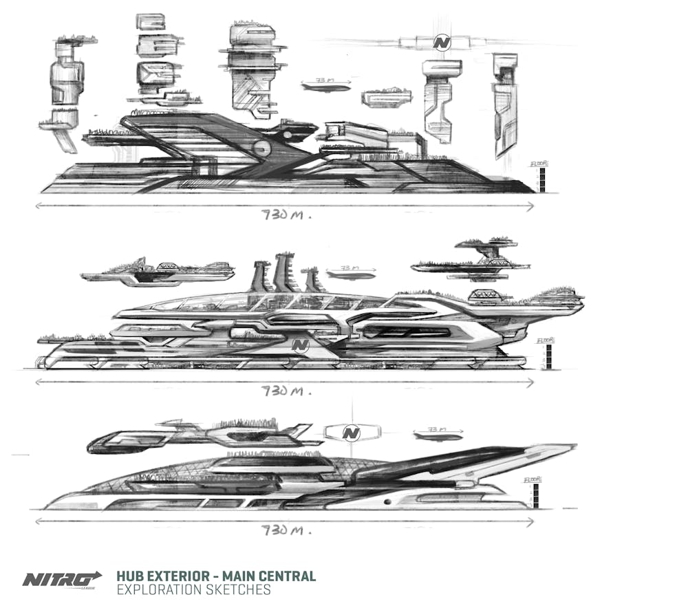 This is an environmental concept I created for a future racing game titled 'Nitro'. The key visual of the environment features an external view of a central hub where players can roam around and interact with digital experiences and car shows. I used ZBrush and rendered the environment scene in Keyshot before painting over it in Photoshop.