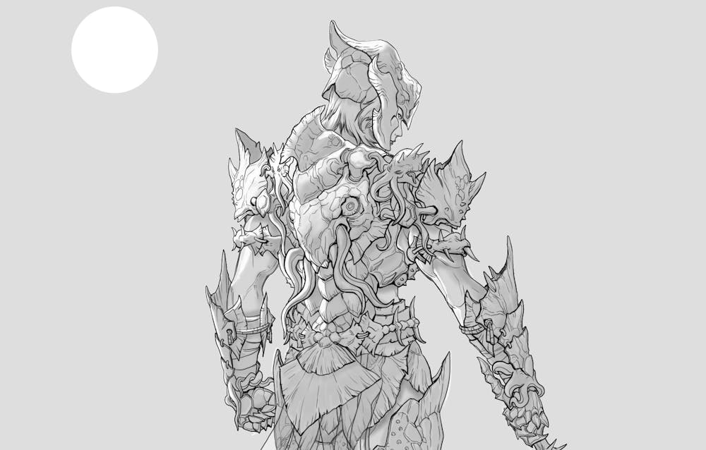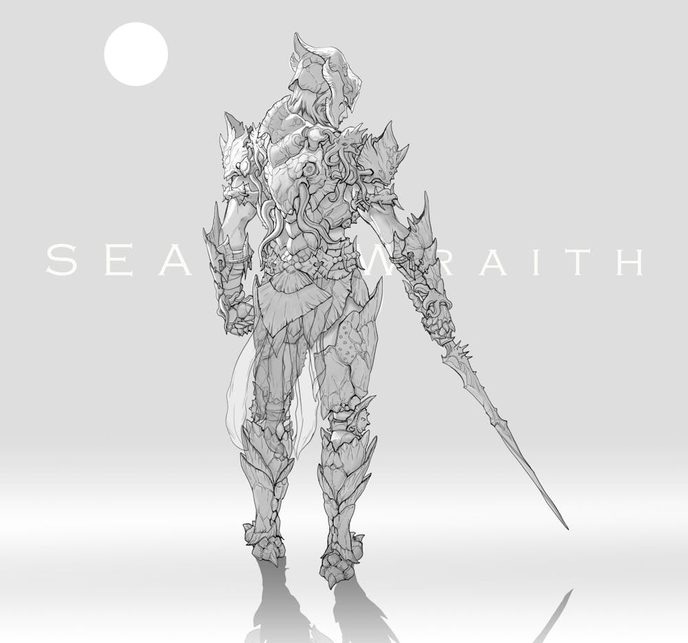 A black and white study exploring a mysterious, ghostly oceanic presence. "Sea Wraith" is an experimental piece where I’m testing new concepts and techniques inspired by the deep sea. Notably, octopus tentacles are integrated into the design—acting as strings to secure both the armor and the weapon.