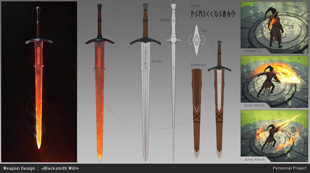 The illustration represents the 'Blacksmith's Will', a magic silver longsword used by Greghor Kardh, a forge cleric.