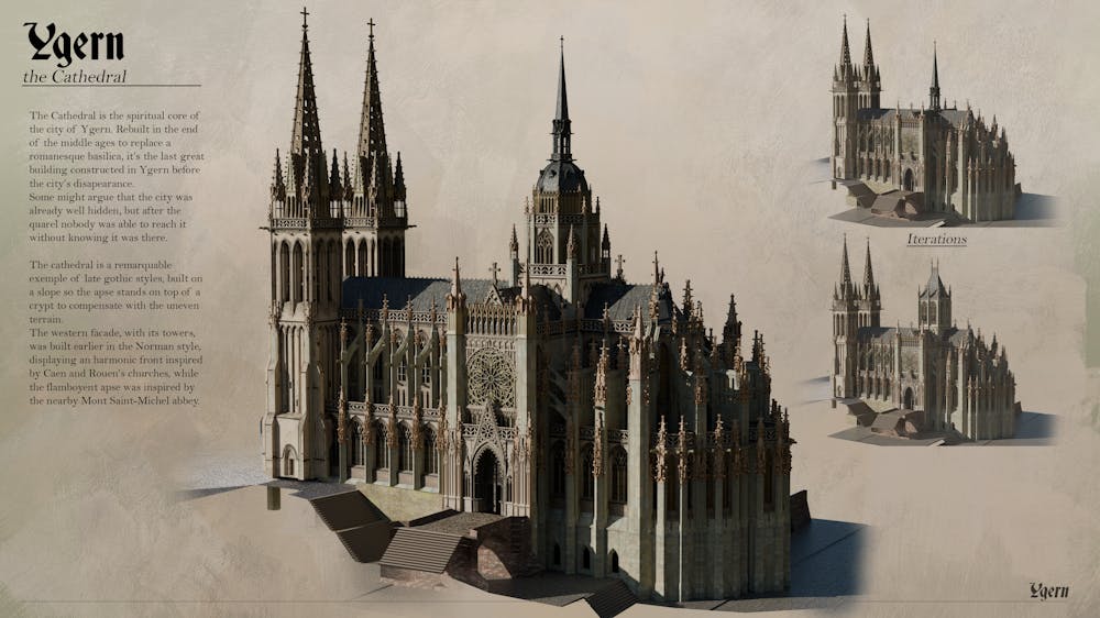 So I built this cathedral to challenge myself, see how far I could push a project in Blender. Almost everything about this building is period accurate, its design is entirely based on churches of Normandy and Britanny and the style is something that could have been constructed at the end of the middle ages. It borrows elements of churches Saint Peter of Caen, Saint Ouen of Rouen, Rouen's Cathedral, Saint Pol de Leon's Cathedral and Mont Saint Michel abbey. The crossing tower, while being the most fantasy element, is based on Bayeux and Evreux Cathedrals. The houses around are borrowed from britton and norman cities, including Rennes, Vannes, Lannion, Granville and Honfleur.