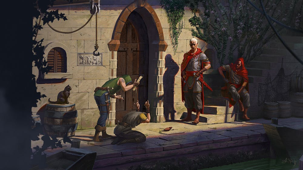 Fighter priests of Sogron the fire god making business with members of a smaller thief clan at the docks of Shulur, the capitol of Toron.