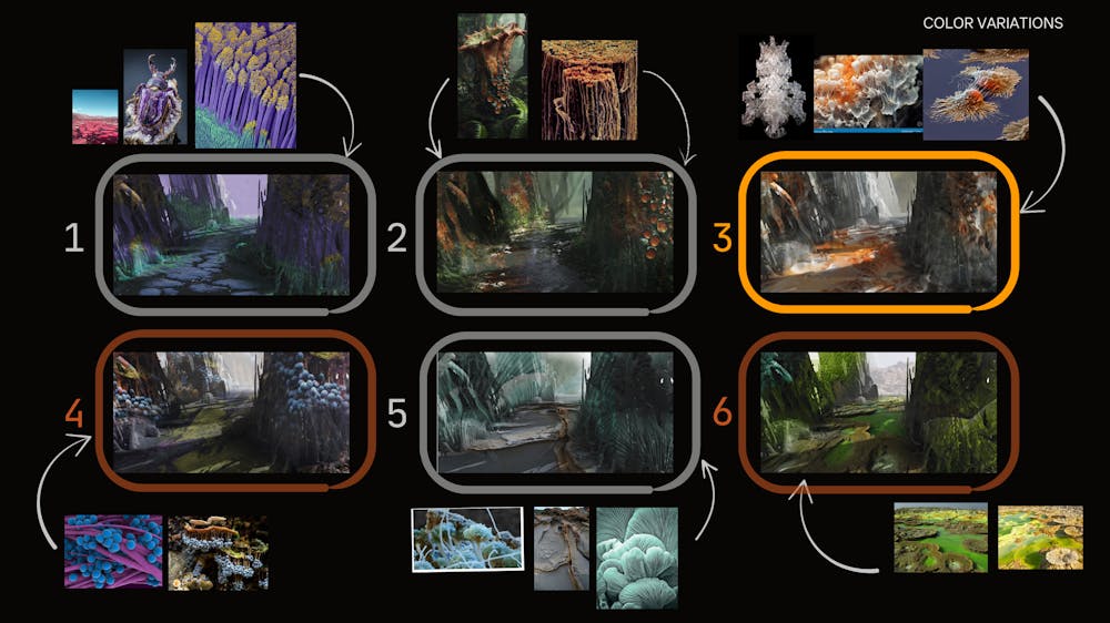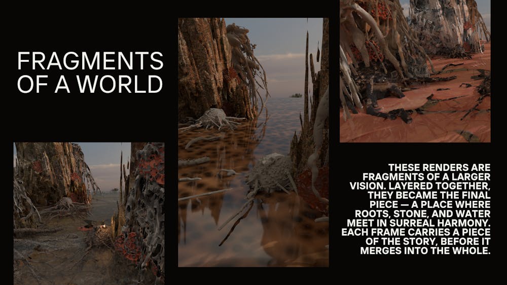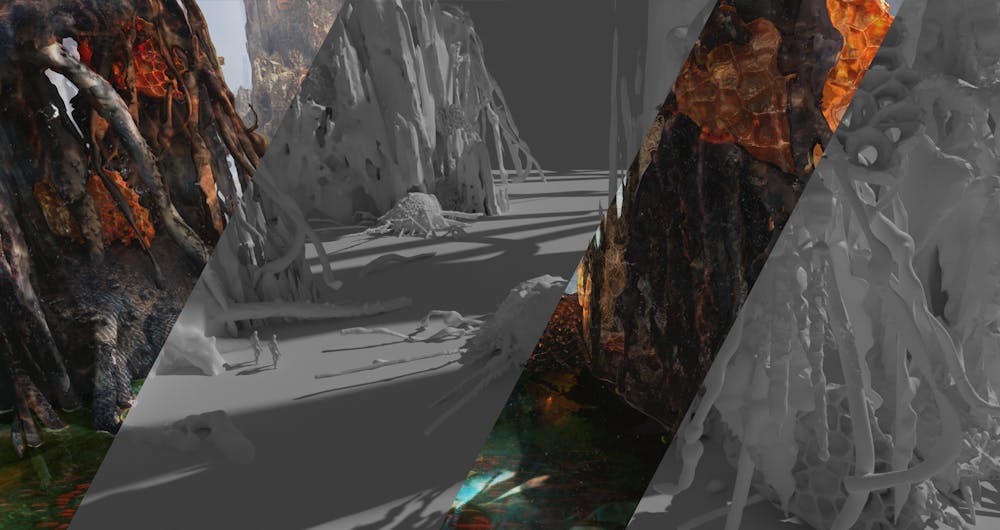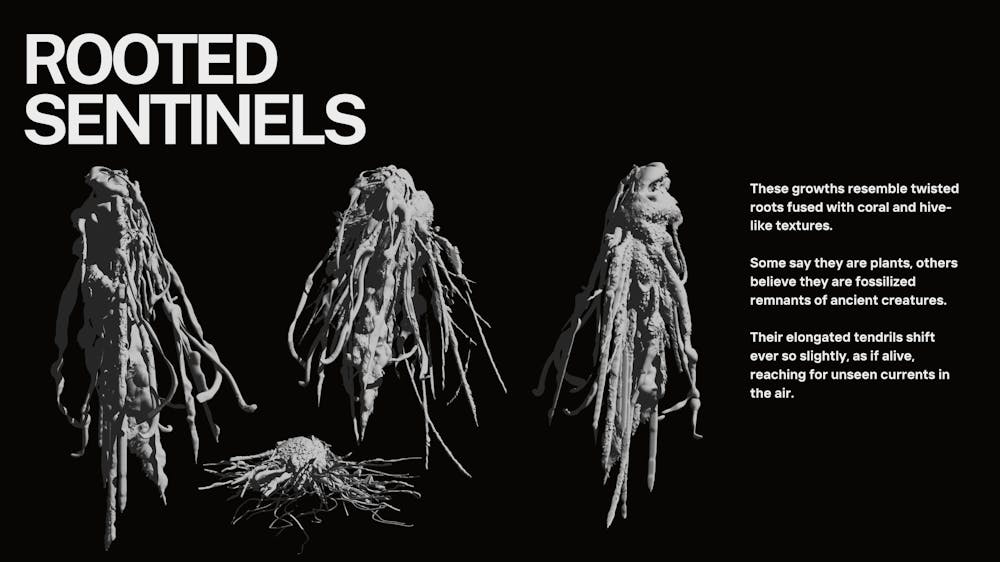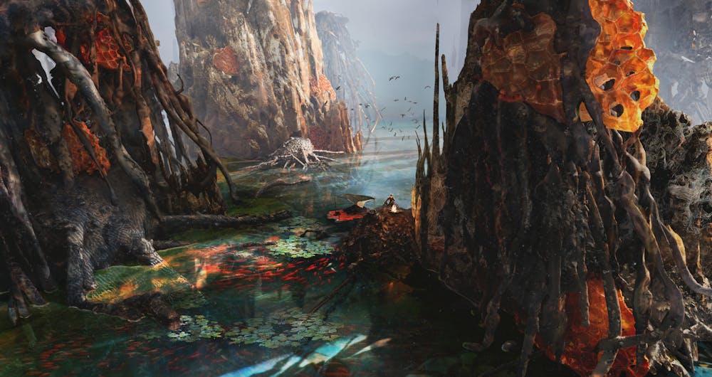 This piece depicts a surreal swamp where colossal root structures intertwine with hive-like formations glowing with organic light. The scene portrays an alien world slowly uncovered by two traveling explorers.