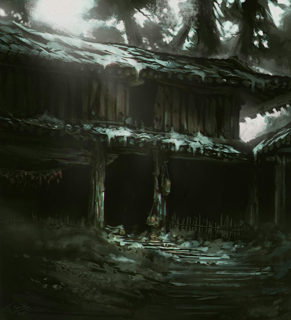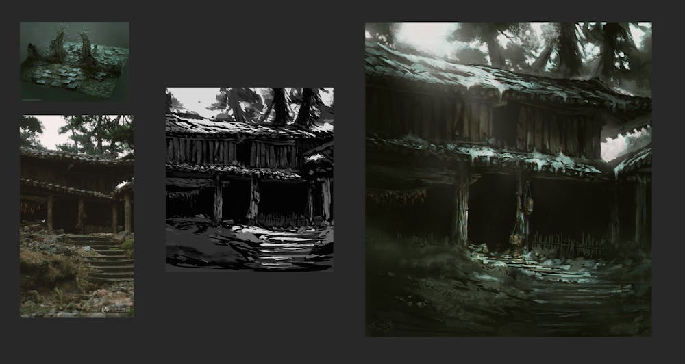 I had one ref for layout and another for the mood and colors. I've started with notan sketch (only black and white), then I added some extra values, then color and some details and adjustments here and there.
