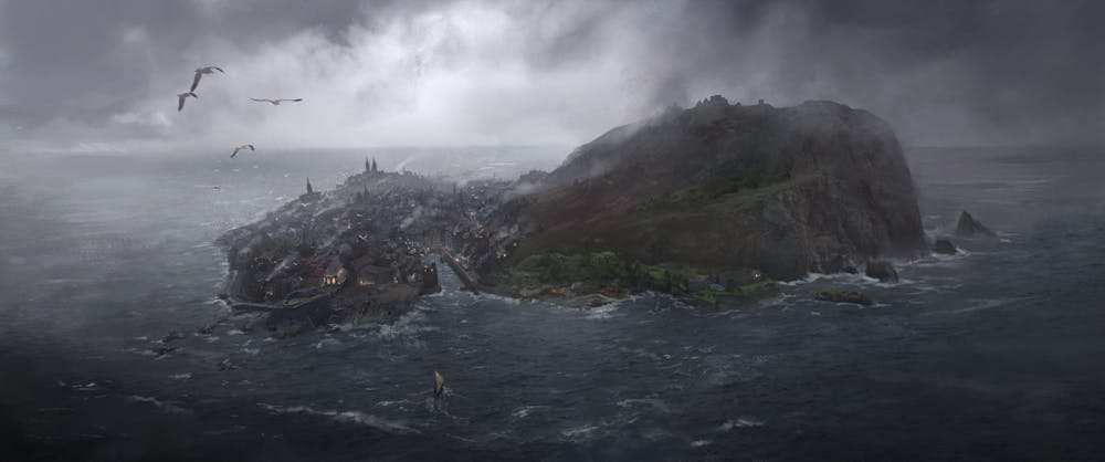 I'm always fond of maps, that's why you'll find one there. The rest is a mix of mood paintings and sketches to find the right look for the island, it will serve as a guide for future artworks based on this setting. There's also a couple of sketches done one year ago to figure out the general mood of the place, the aerial view done on photobashing is from the same period. It helped figure out which assets to build and the general layout of the island (notice that the hill changed size during the process, from a smaller rock it became a more important feature, dominating the landscape. There was also a land bridge originally which was dropped, because I couldn't justify the position of the island in the story.