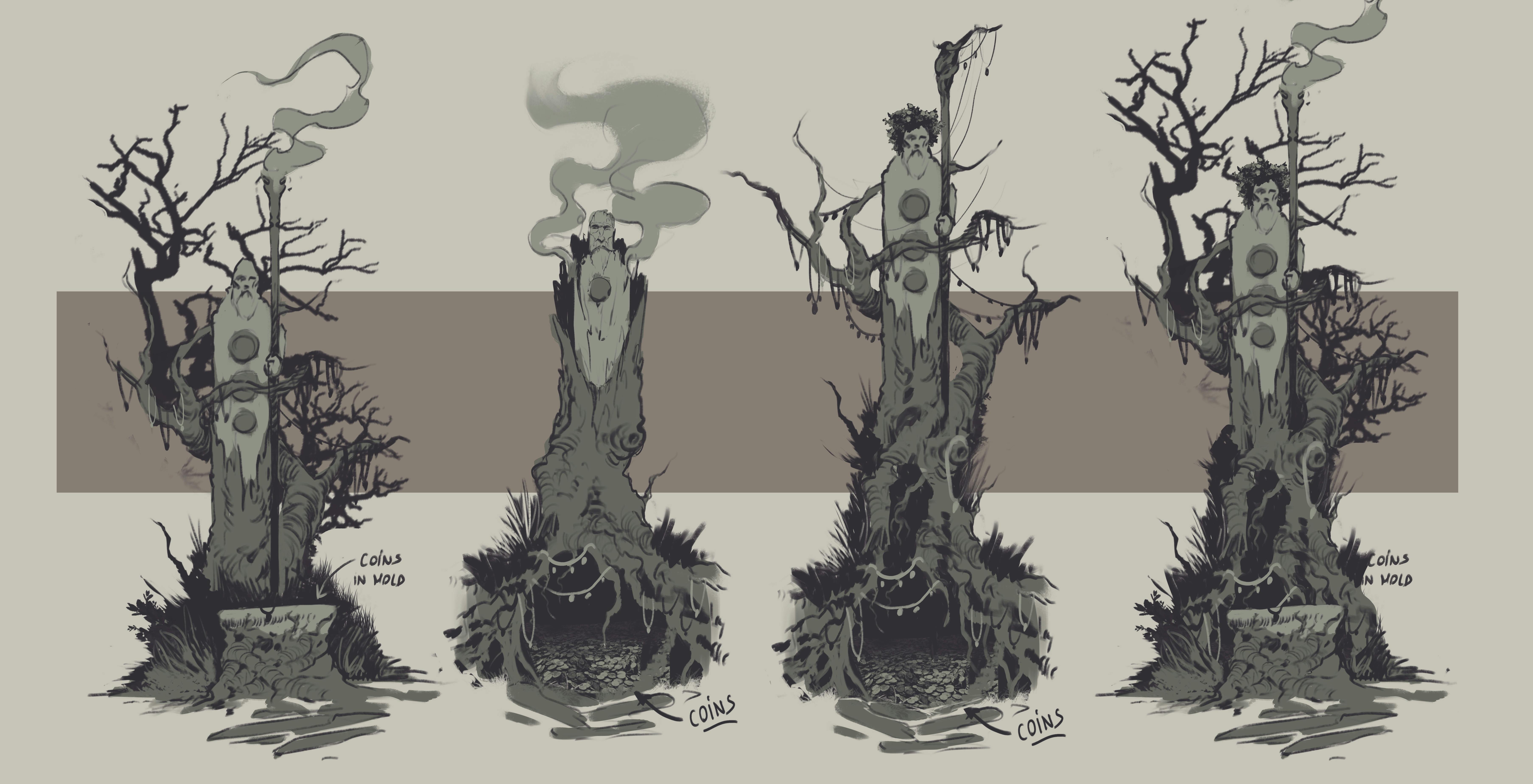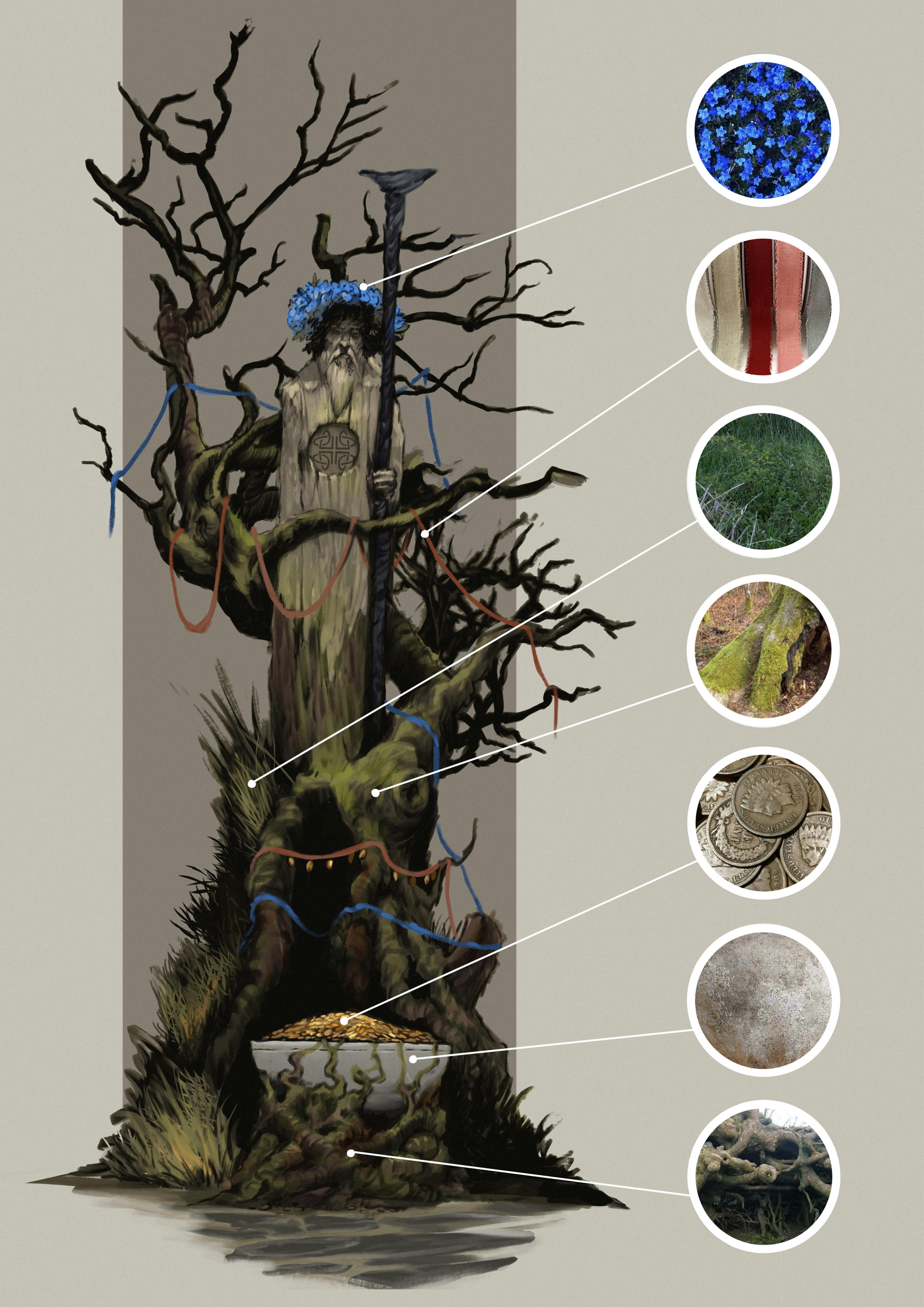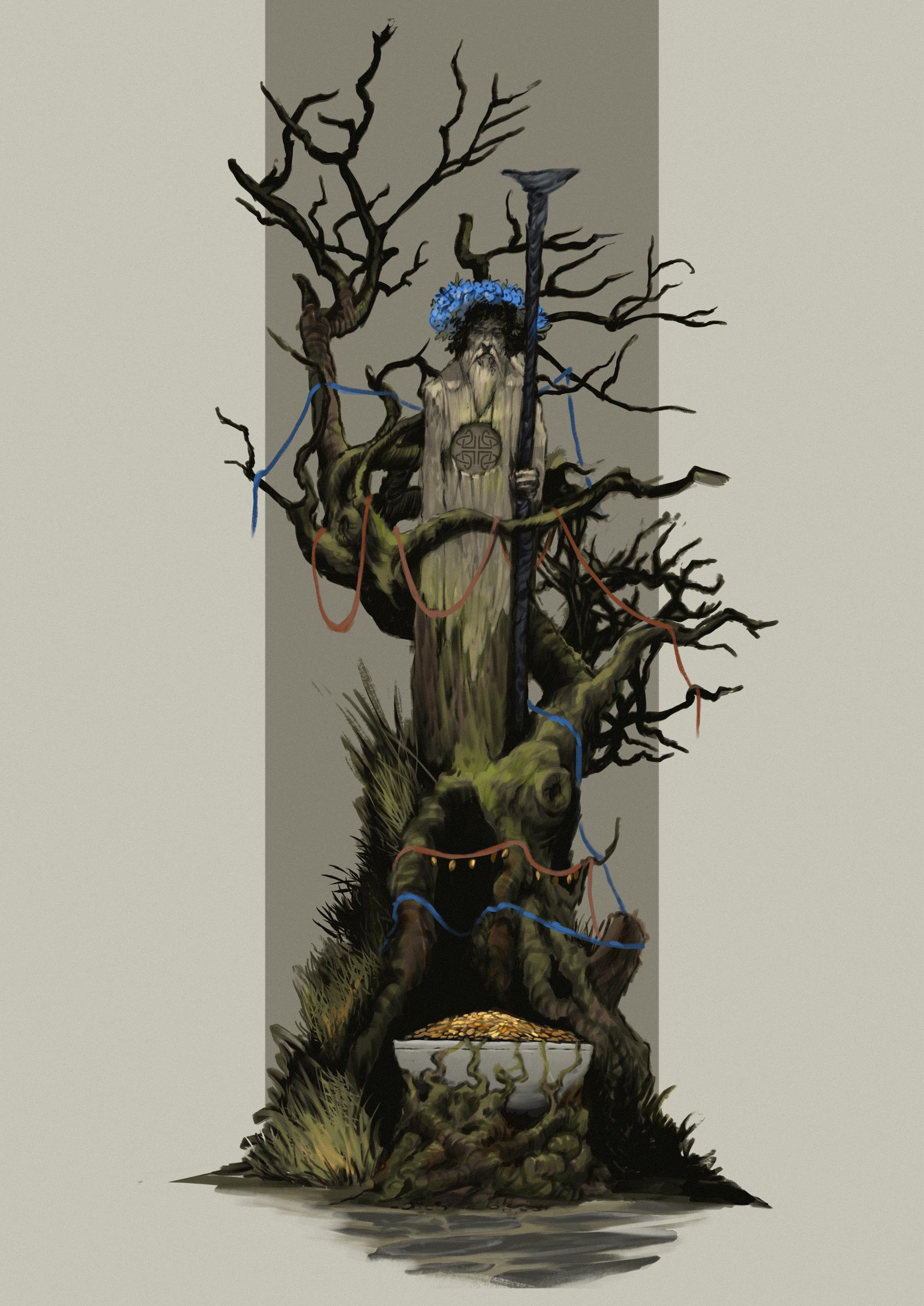 At the entrance to the Old Forest stands a tree set apart from the rest of the woods, adorned with colorful ribbons, medallions, and flowers. From its main trunk emerges a carved figure of a bearded old man leaning on a staff, and at his feet, entwined in thick, ancient roots, lies a stone bowl filled with coins.